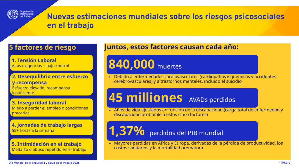 La OIT advierte que los riesgos psicosociales no solo afectan a la salud mental, sino también a la física, provocando trastornos del sueño, dolores musculares, deterioro cognitivo e incluso mayor riesgo de suicidio en sectores como la construcción, la agricultura o los servicios de emergencia .
